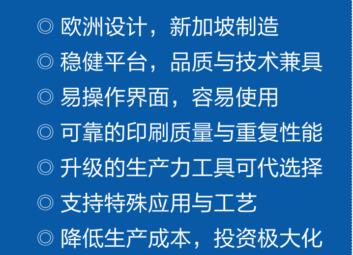 Eby DEK印刷機,歐洲設計,新加坡制造。穩健平臺,品質與技術兼具,易操作界面和容易使用。可靠的印刷質量與重復性能。